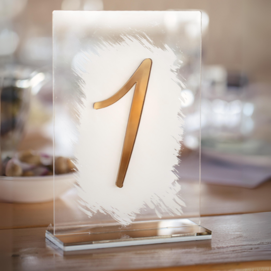 Elegant Custom Acrylic table numbers with gold mirror accent and white backer.