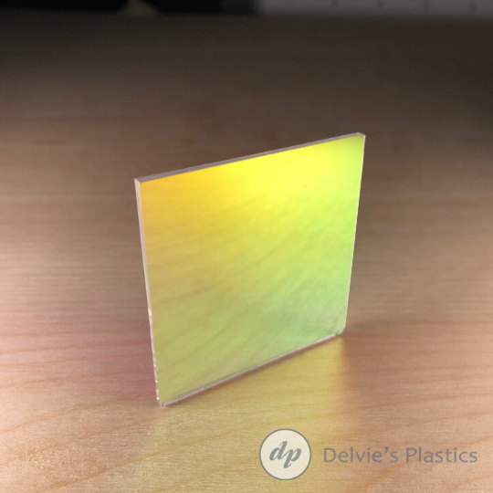 Our Iridescent sheet contains a rainbow of colors that change with each perspective. The unique film shimmers in the light, and cuts beautifully when laser engraved, making it perfect for cake toppers, jewelry, crafts, signs, and any project that requires eye-catching iridescent colors. The sheet is transparent, and easily seen through.