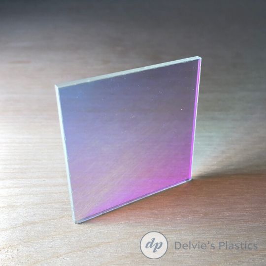 Please note: use care while peeling the clear masking to avoid removal of the iridescent film. Approx 1/8" of the edges may not be usable in certain circumstances. Cutting this material with a standard saw blade may affect the edges of iridescent film. Laser cutting is recommended.